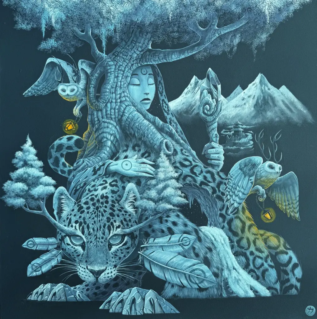 Quadro commissionato e ispirato alla carta numero 11 dei tarocchi, la Forza. Una donna doma un leone con energia femminile: ascolto ed accoglienza. Il leone, in questo caso simbolo degli istinti primordiali che ci abitano, è al suo completo servizio.
