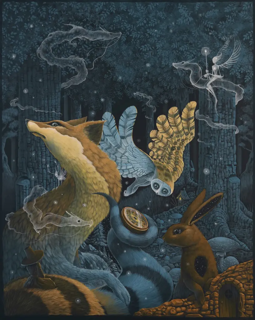 Nel centro del bosco il tempo è arrivato, una nuova fase rappresentata dal coniglio guardiano della soglia si apre custodita tra la volpe e la sua coda, un nuovo fluire sotto le stelle.Una nuova via magica cattura lo sguardo della civetta mentre osserviamo ancora seduti e ci sentiamo sorretti da spiriti un tempo invisibili.